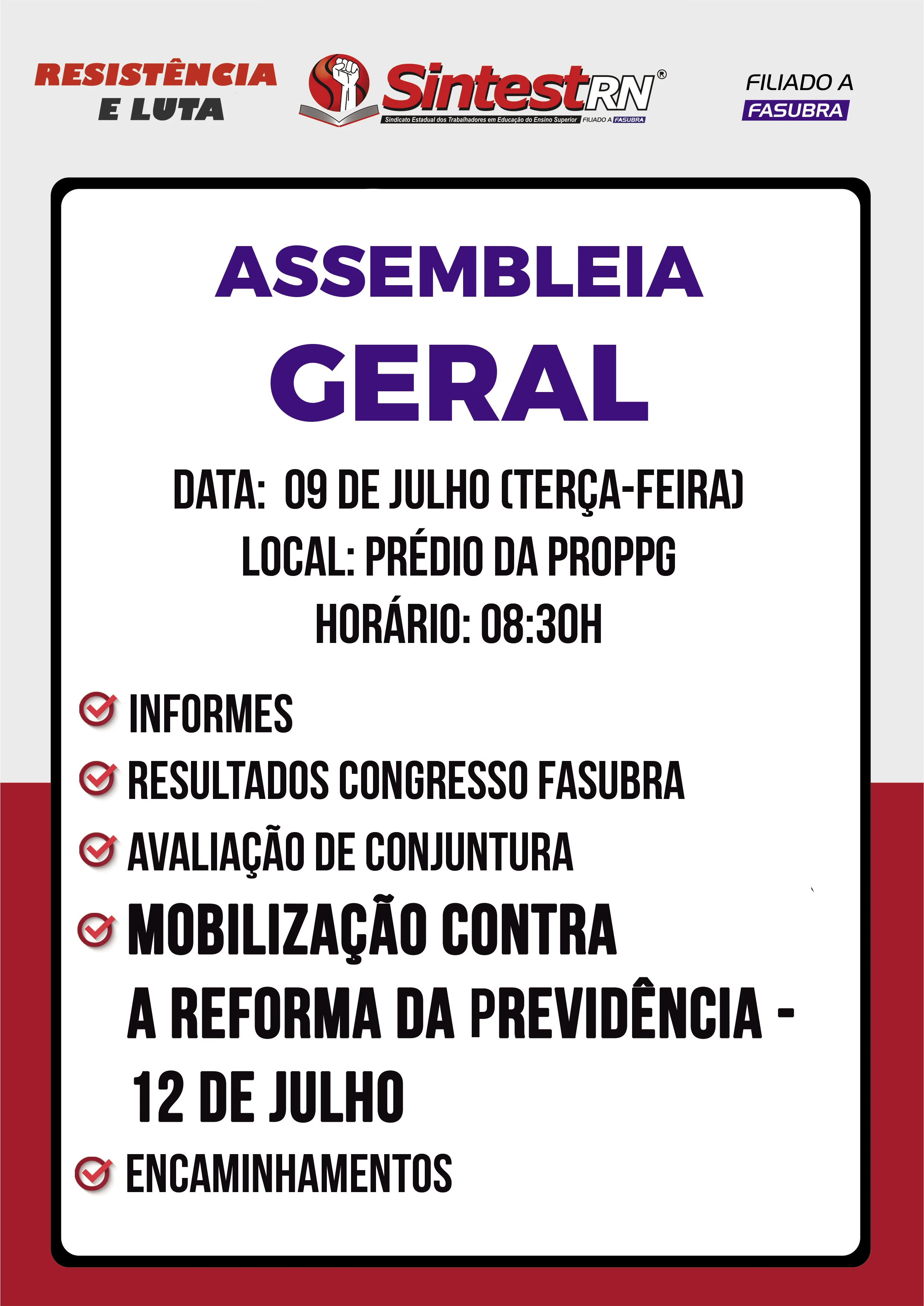 Também será um momento de articulação para o dia 12 de julho. A FASUBRA sindical não deliberou paralisação, mas orienta que as bases promovam mobilizações com os trabalhadores sobre a reforma da previdência.