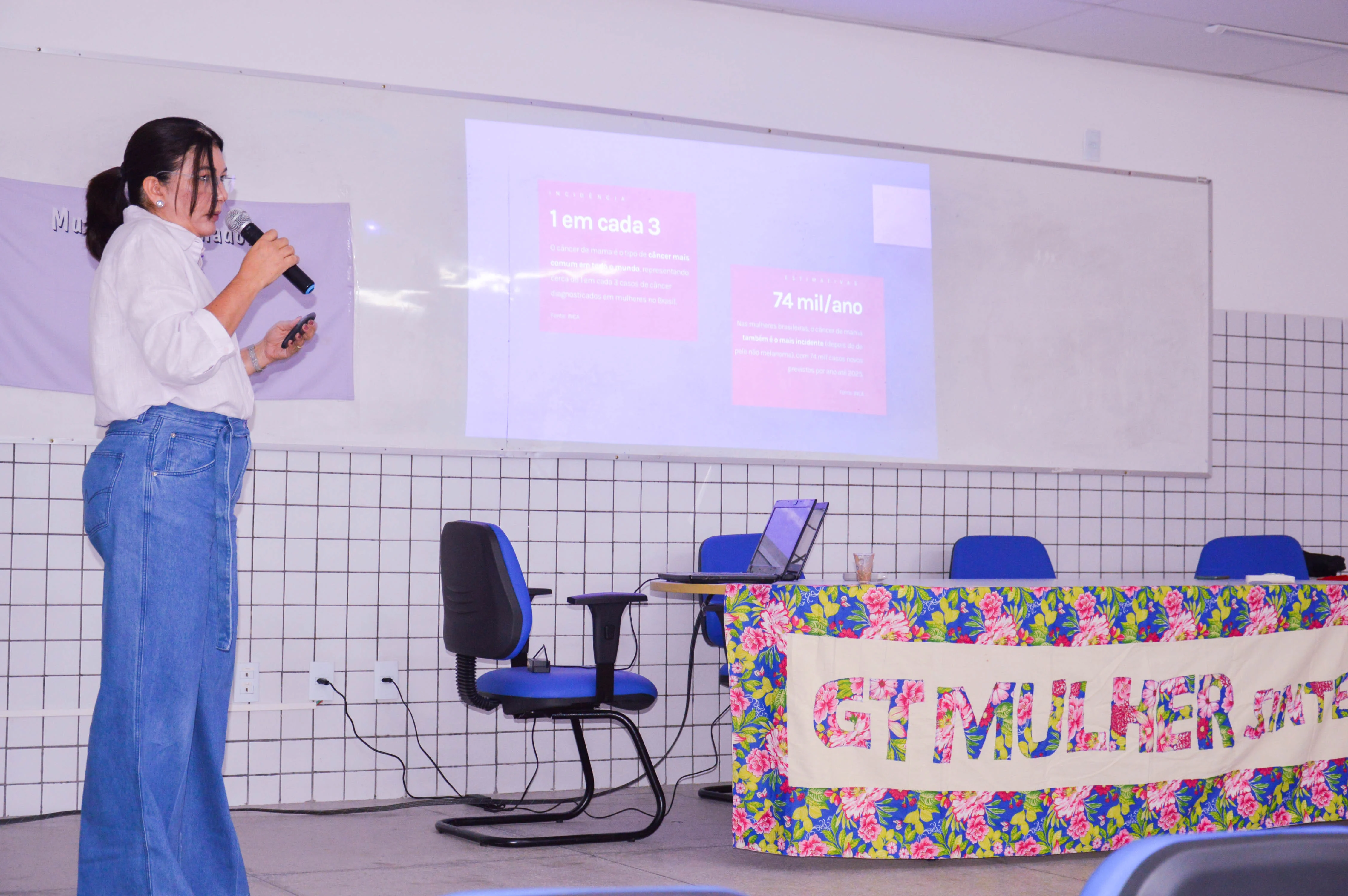 Em seguida, a Dra Osvanir Góes falou sobre “Câncer de mama: sinais de alerta e direito ao diagnóstico”. “O maior conselho que eu posso te dar é que câncer de mama tem cura”, foi com esse sentimento de esperança que a Dra falou sobre o tipo de câncer mais frequente na mulher brasileira.