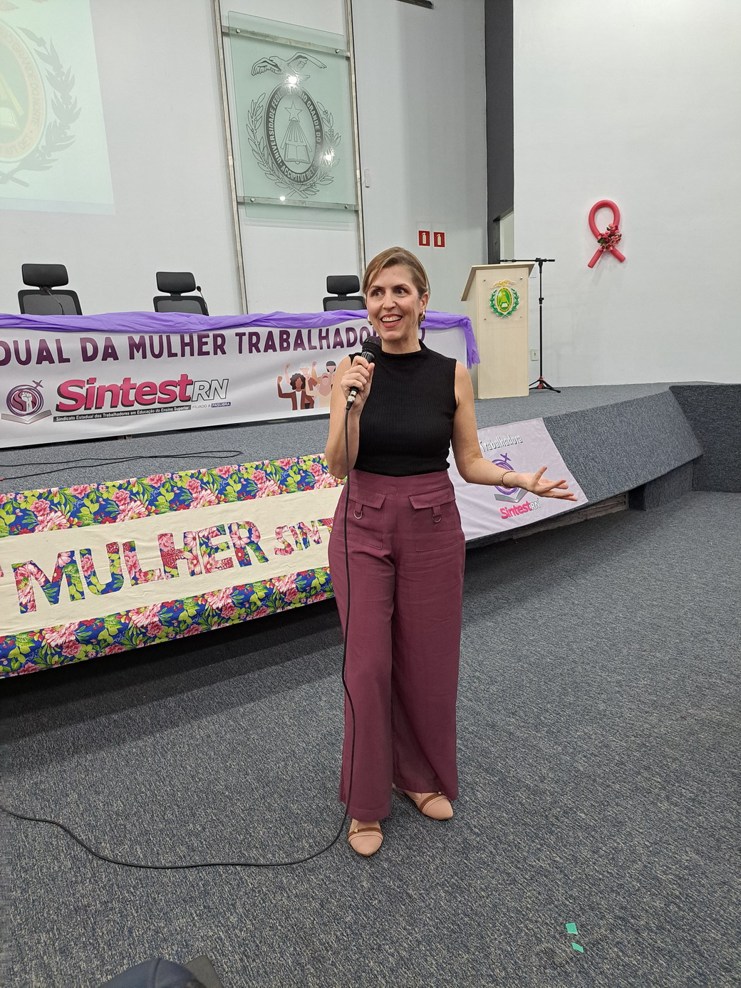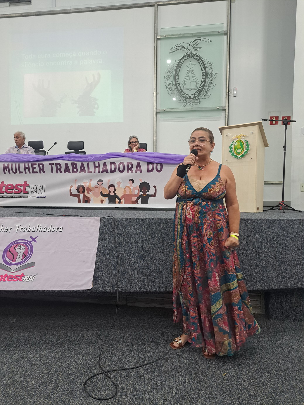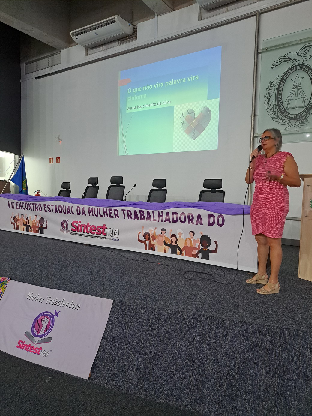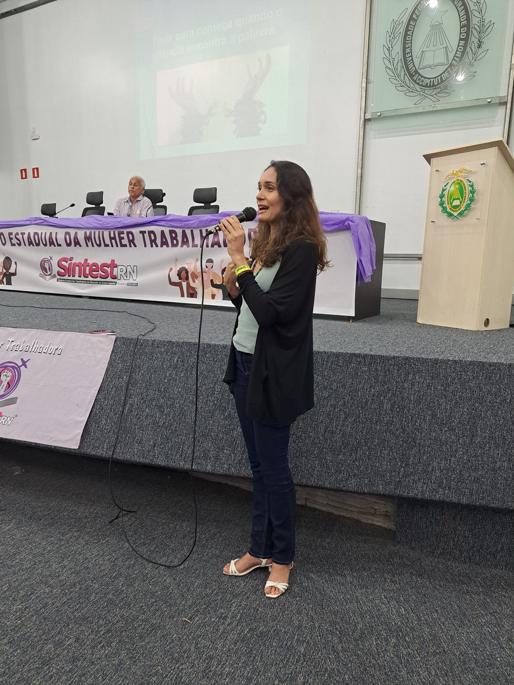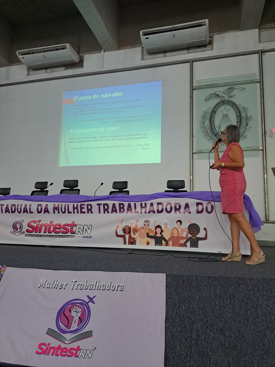 A tarde começou com a palestra “O que não vira palavra, vira sintoma!”, ministrada por Áurea Silva, enfermeira, mestre em Gestão Pública e coordenadora de Finanças do SINTEST-RN. O momento promoveu uma profunda reflexão sobre a escuta ativa e o acolhimento emocional, estimulando o compartilhamento de experiências entre as participantes.