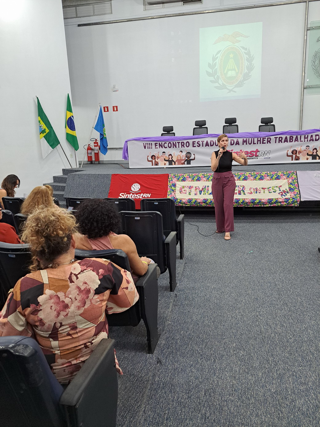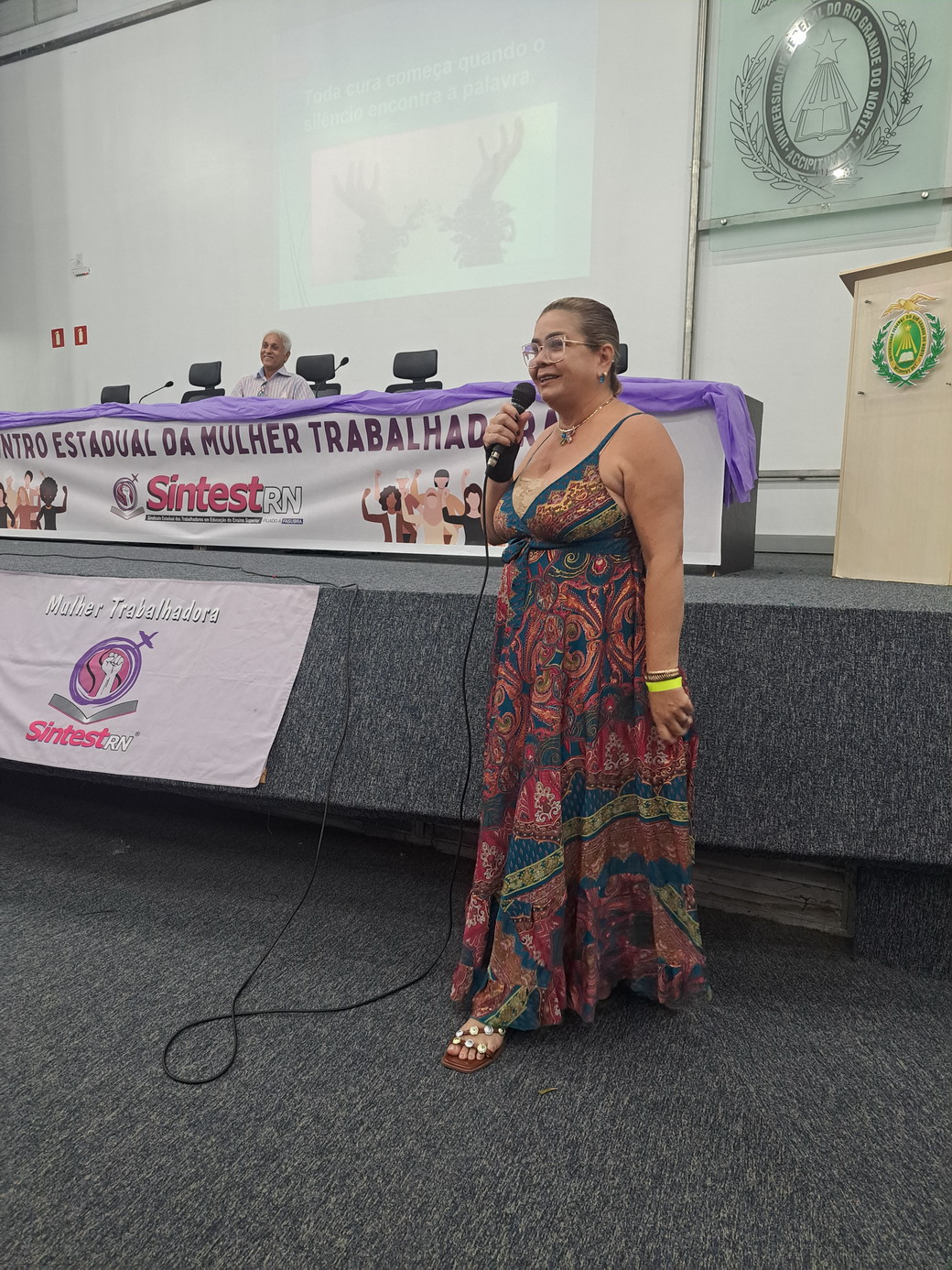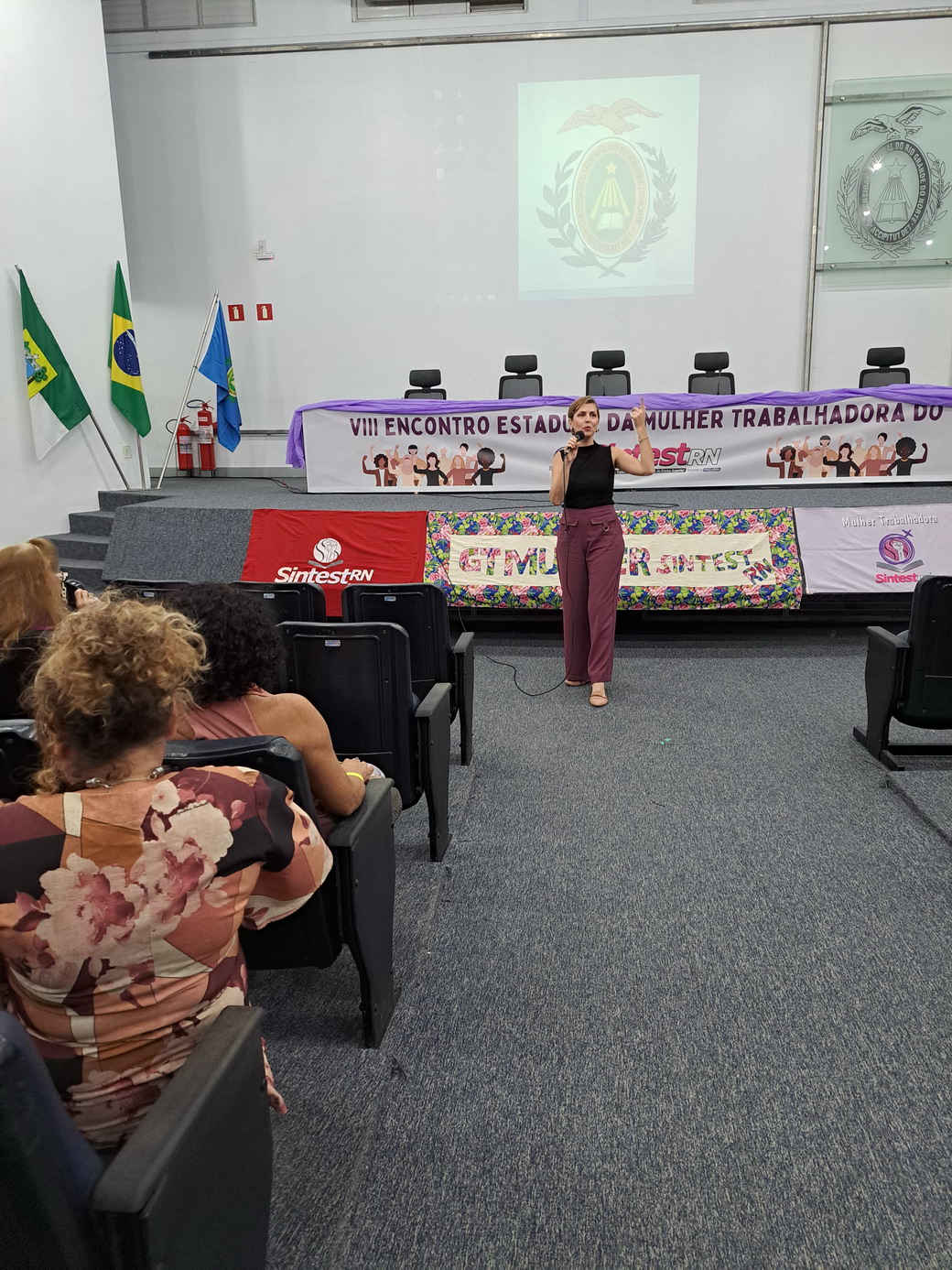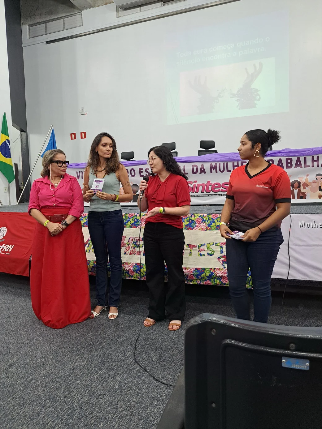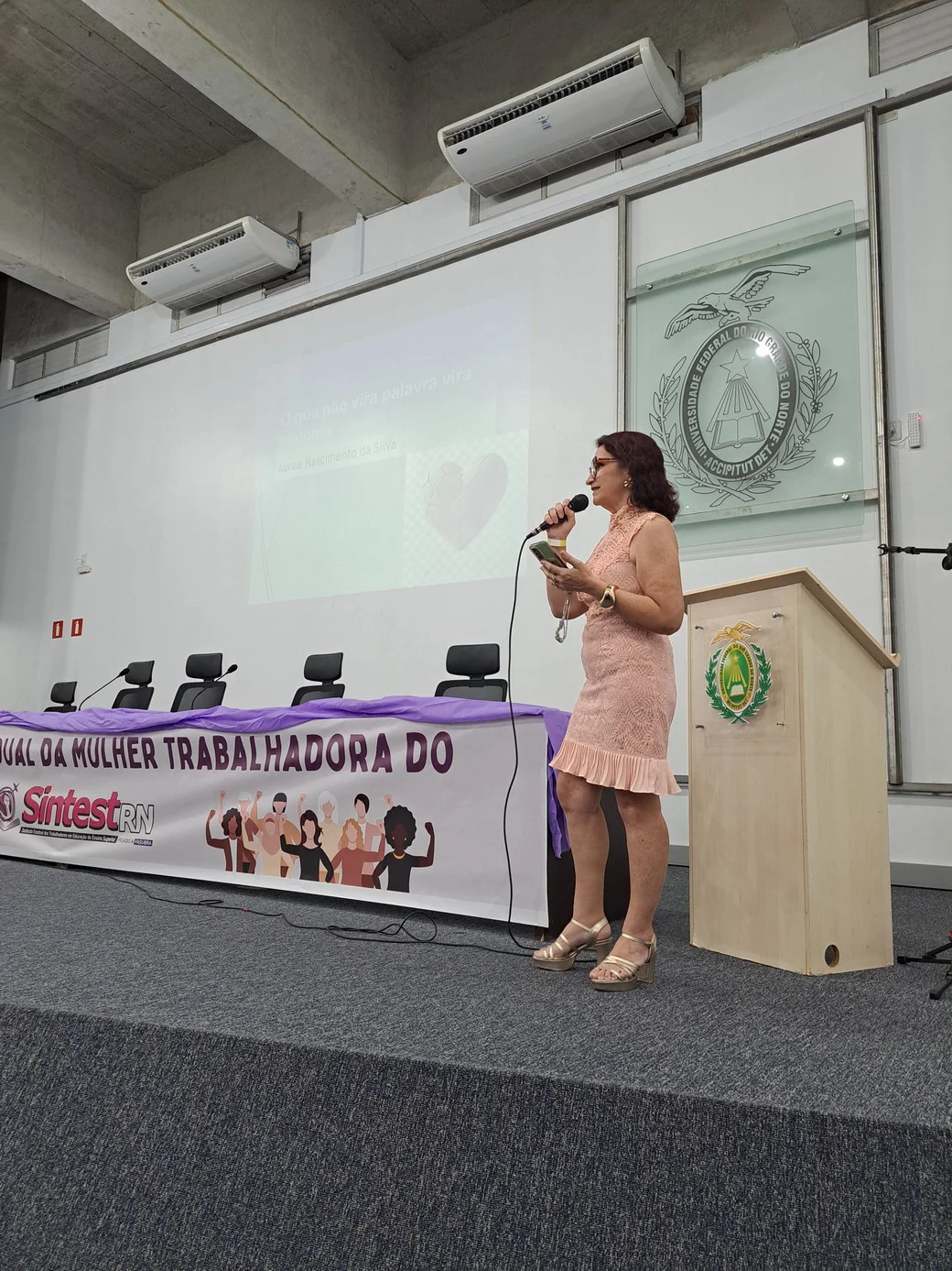 A tarde começou com a palestra “O que não vira palavra, vira sintoma!”, ministrada por Áurea Silva, enfermeira, mestre em Gestão Pública e coordenadora de Finanças do SINTEST-RN. O momento promoveu uma profunda reflexão sobre a escuta ativa e o acolhimento emocional, estimulando o compartilhamento de experiências entre as participantes.