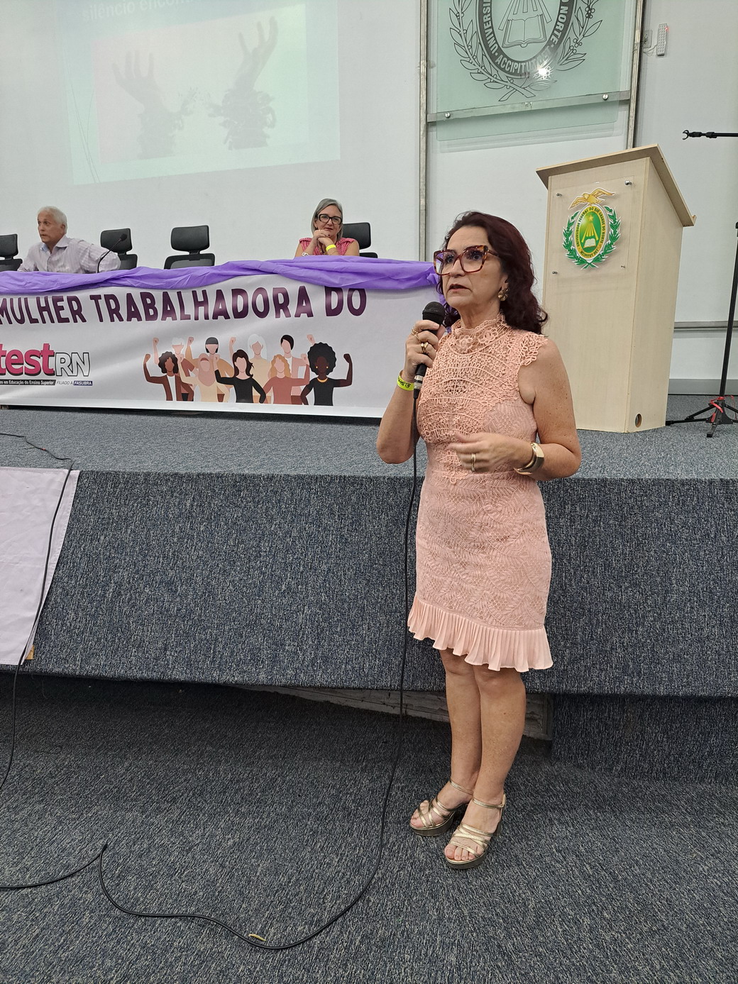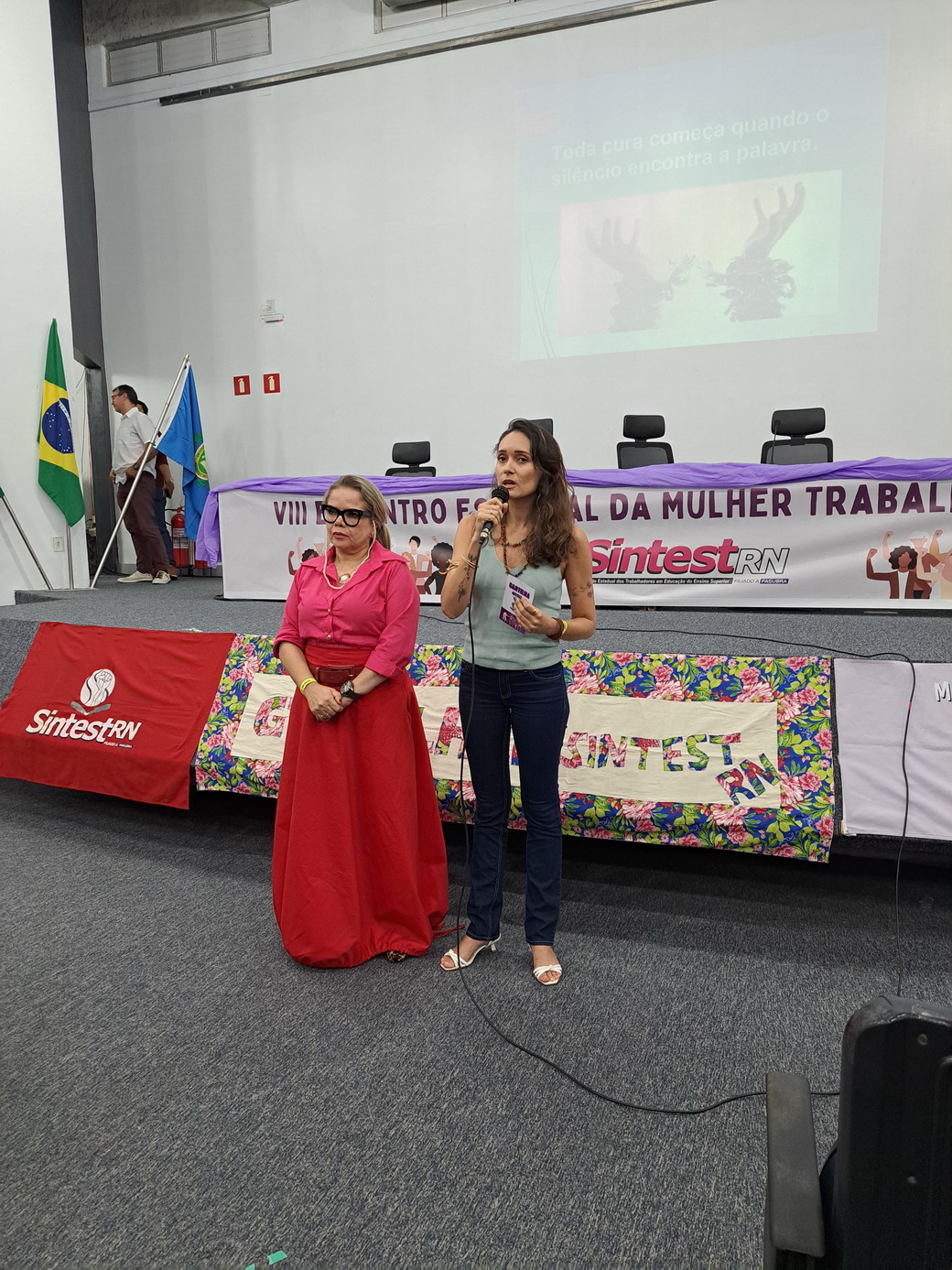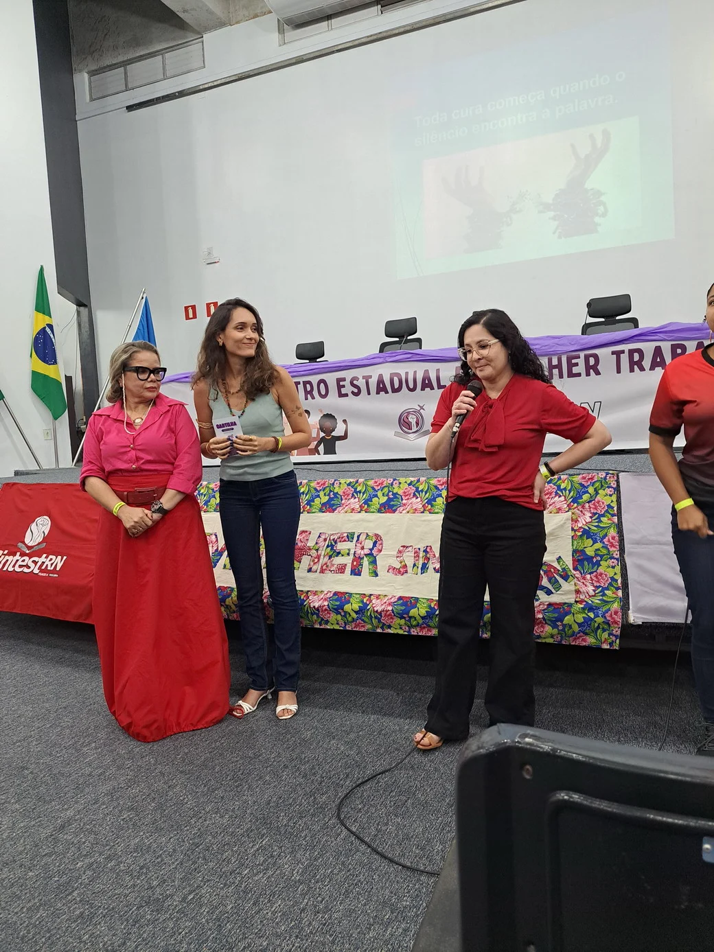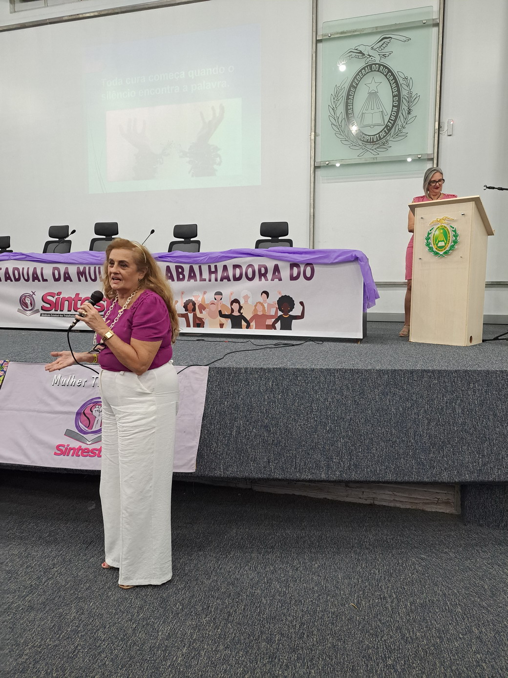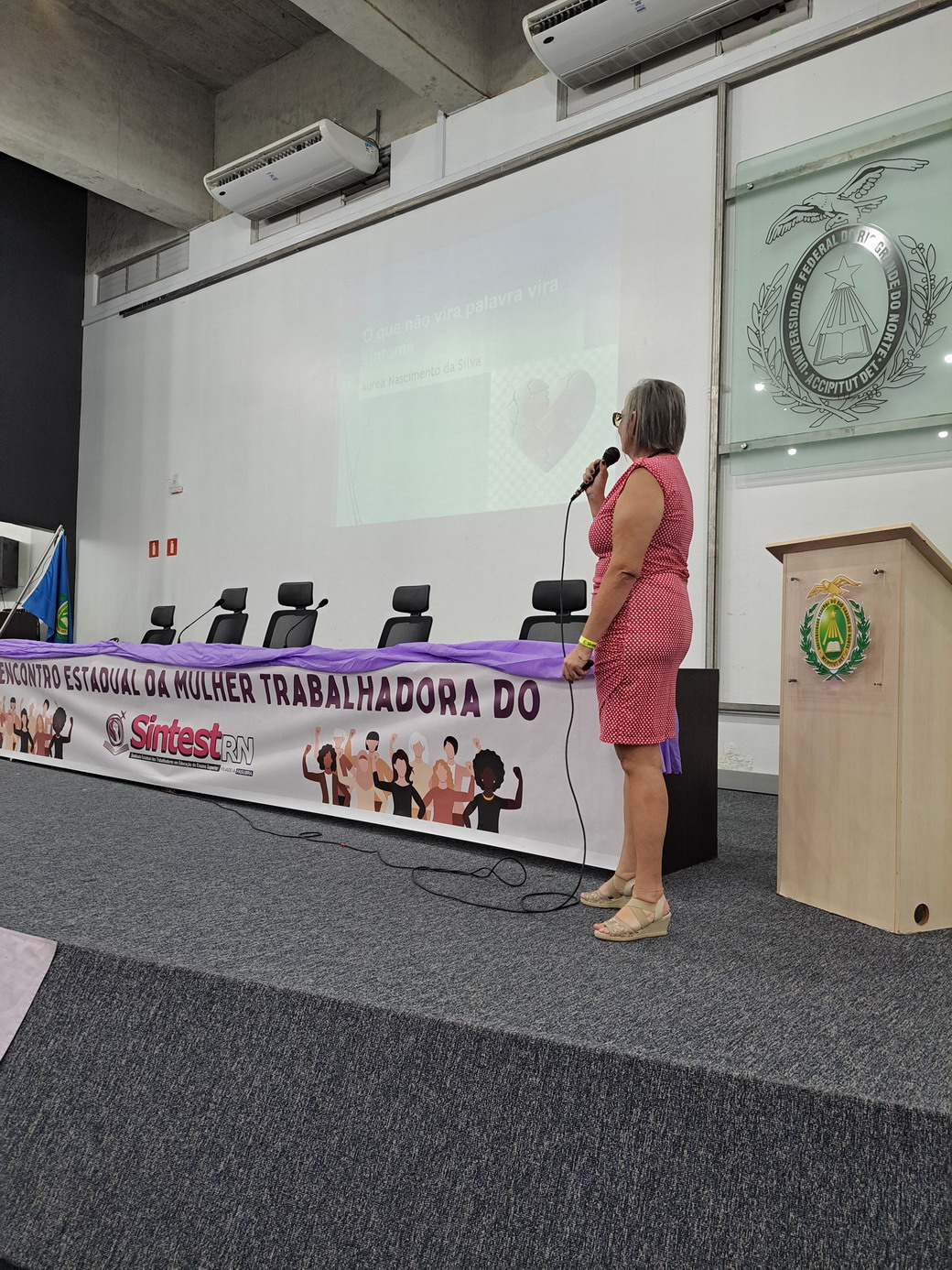 A tarde começou com a palestra “O que não vira palavra, vira sintoma!”, ministrada por Áurea Silva, enfermeira, mestre em Gestão Pública e coordenadora de Finanças do SINTEST-RN. O momento promoveu uma profunda reflexão sobre a escuta ativa e o acolhimento emocional, estimulando o compartilhamento de experiências entre as participantes.