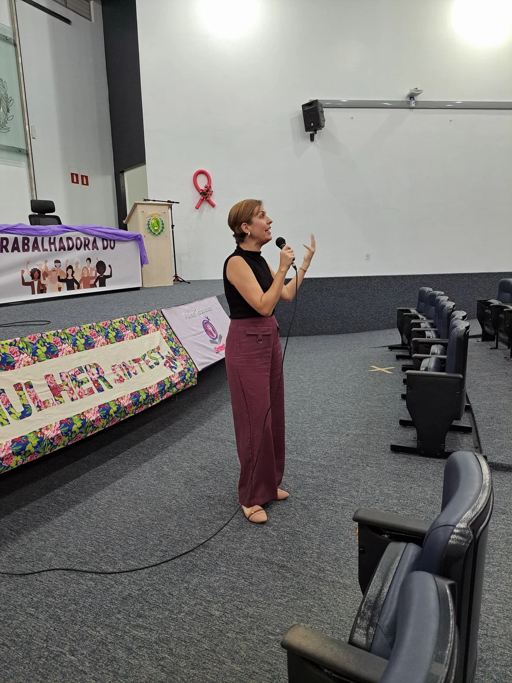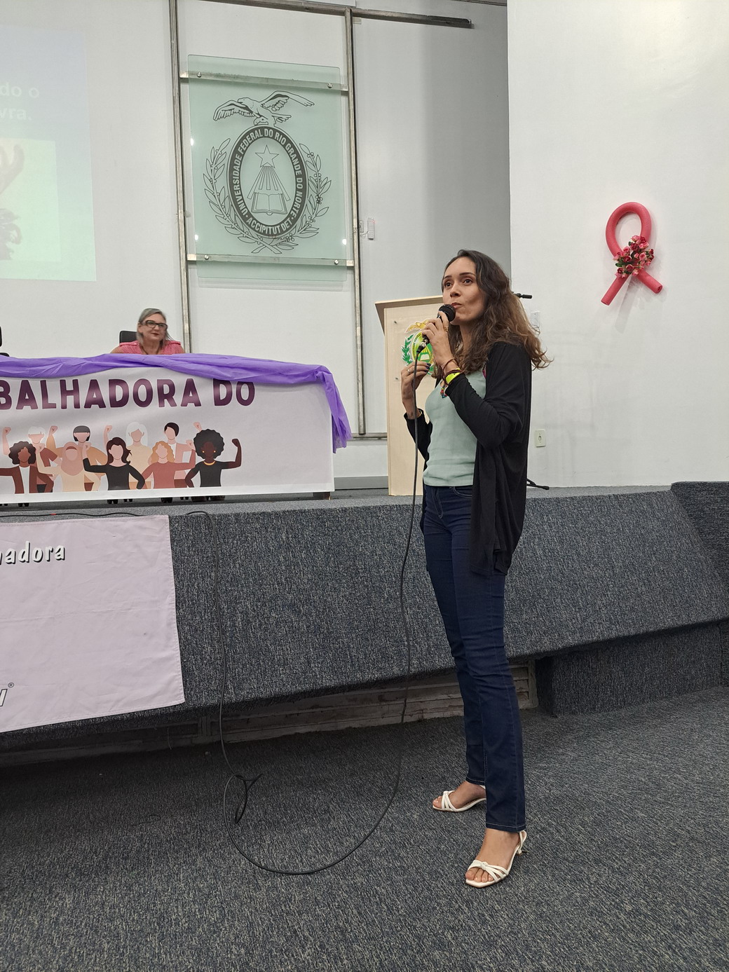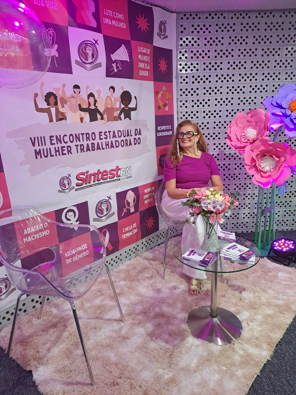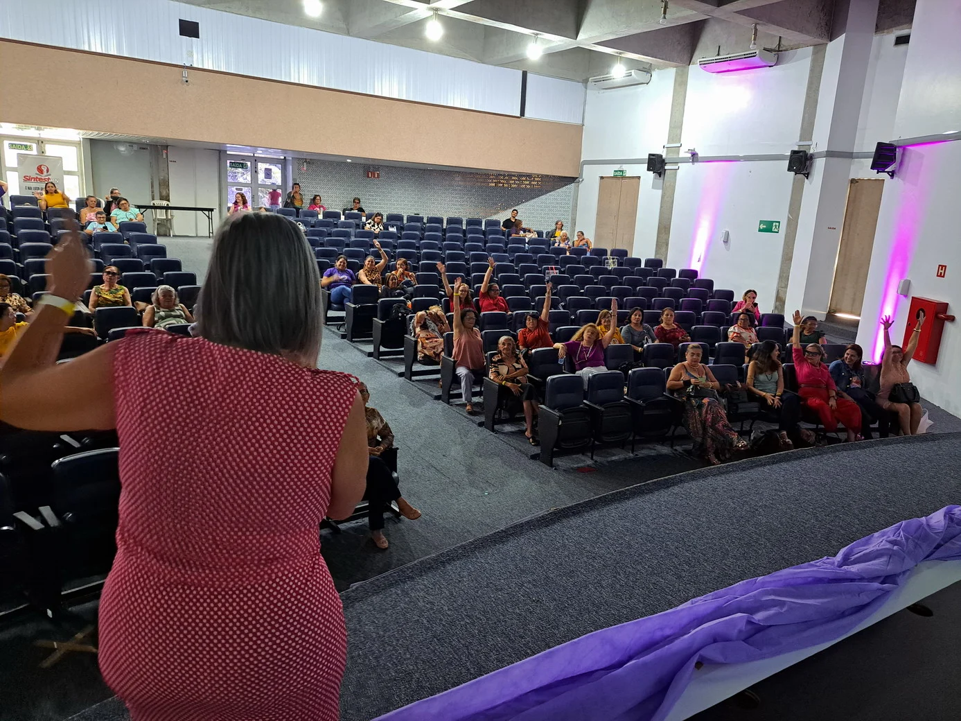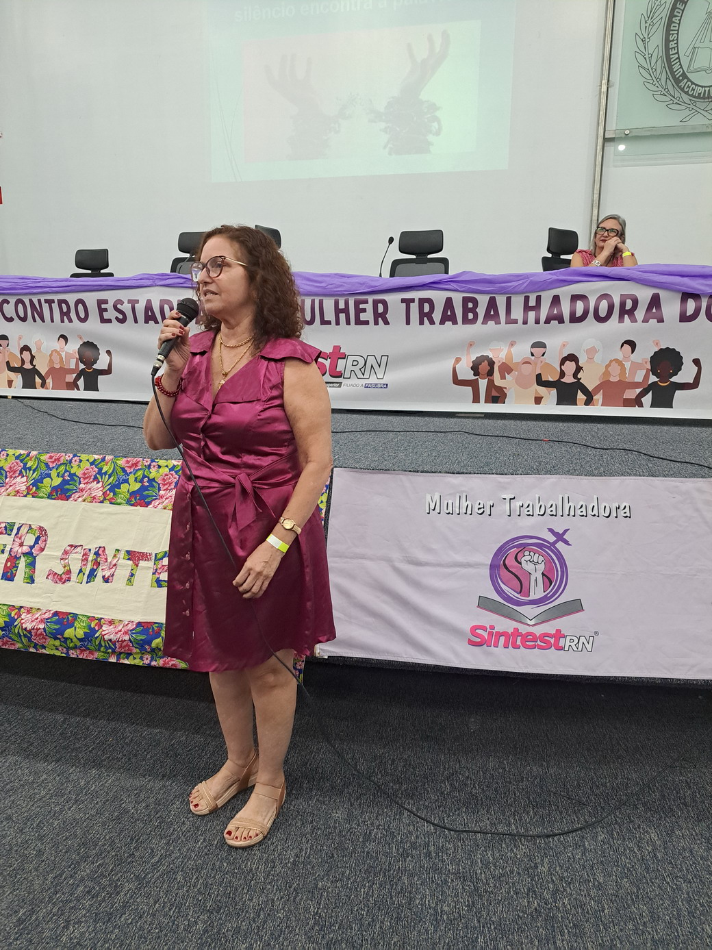 A tarde começou com a palestra “O que não vira palavra, vira sintoma!”, ministrada por Áurea Silva, enfermeira, mestre em Gestão Pública e coordenadora de Finanças do SINTEST-RN. O momento promoveu uma profunda reflexão sobre a escuta ativa e o acolhimento emocional, estimulando o compartilhamento de experiências entre as participantes.